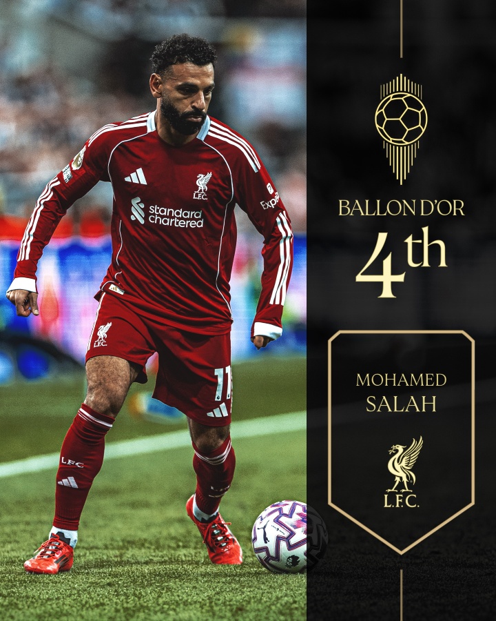 09月27日讯 2025年金球奖,萨拉赫排名第四,今日金球奖官方公布了积分 明细和100名记者的投票详情。