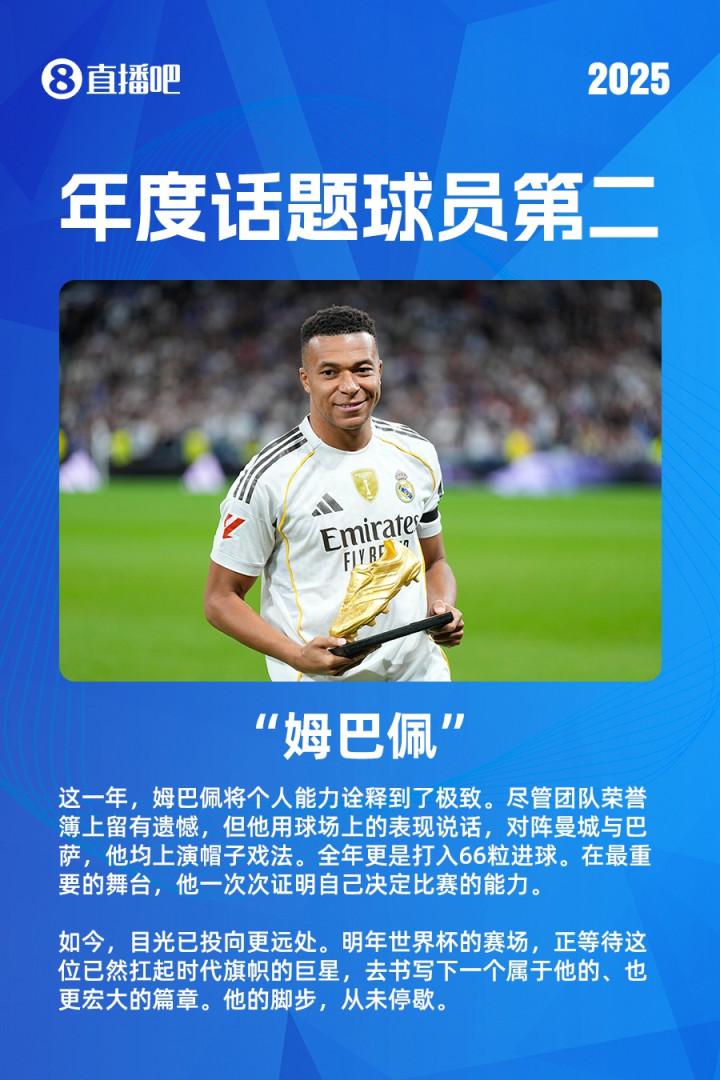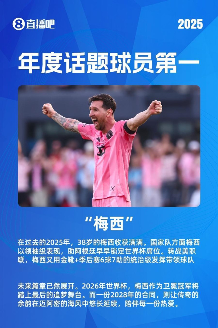 直播吧2025十大话题球员: 梅西三连霸, 姆巴佩C罗二三, 利物浦3人