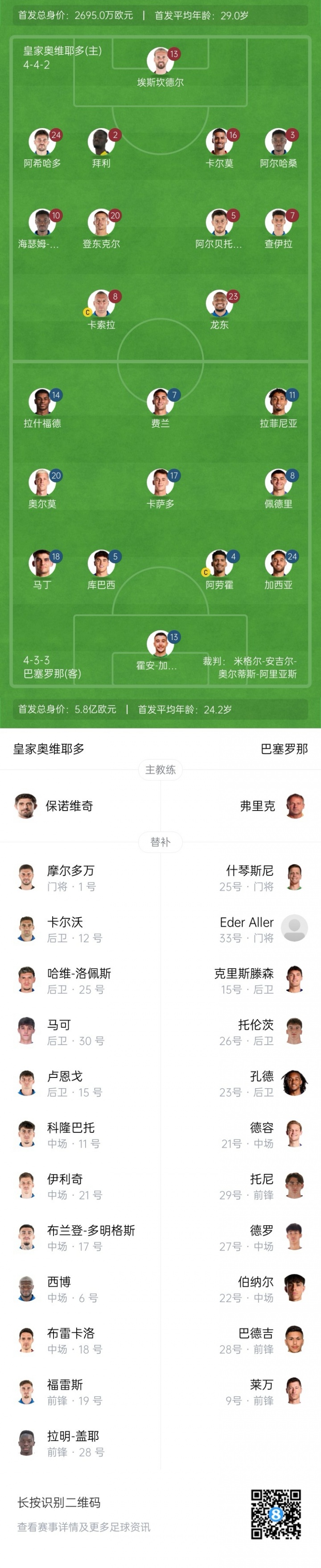 巴萨杆位:13-霍安·加西亚、4-阿劳霍、18-赫拉德·马丁、5-库巴西、24-埃里克·加西亚、8-佩德里、17-卡萨多、20-奥尔莫、14-拉什福德、11-拉菲尼亚、7-费兰