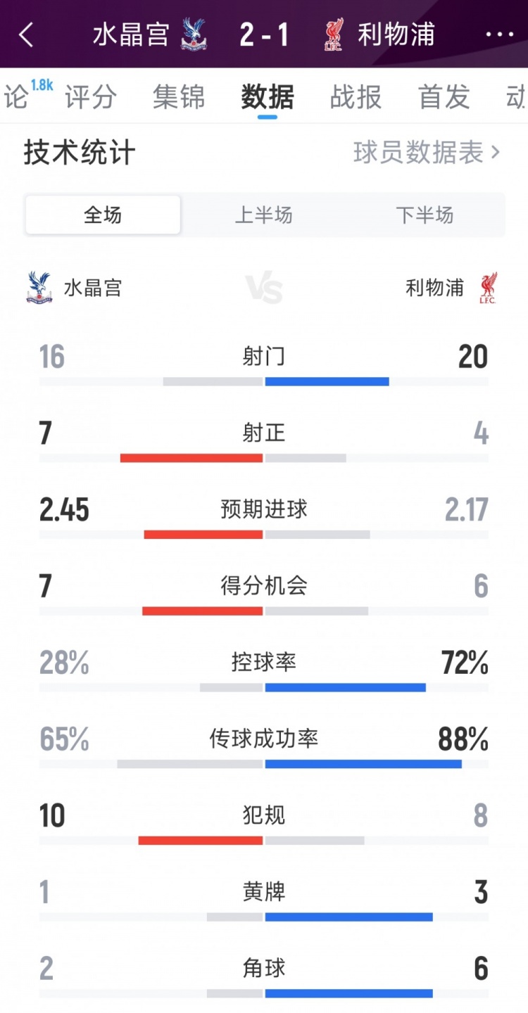 利物浦1-2水晶宫全场数据:射球 20-16,射正4-7,积分 机会6-7