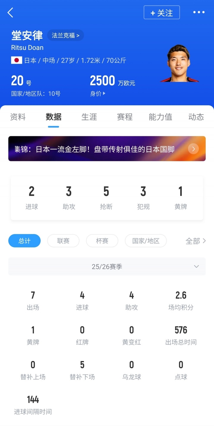 今年夏窗在以9500万欧高价出售埃基蒂克后,苏超直播在线观看法兰克福2100万欧转会费签下堂安律,本赛季至今,堂安律7场赛事 已经贡献4球4助,目前身价2500万欧。