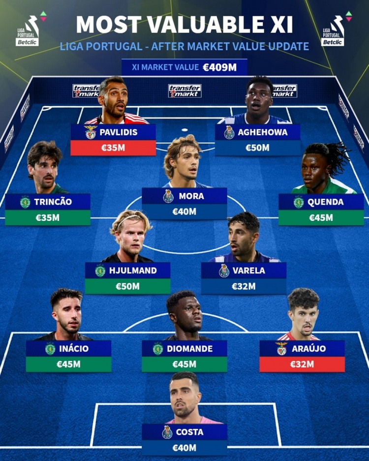 德转列葡超最贵身价阵形 :三巨头包圆,葡萄牙体育5人入选最多