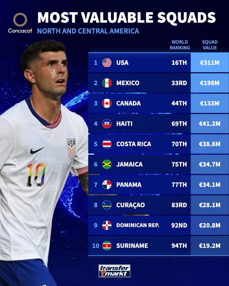 中北美国家队身价榜:美国3.11亿欧居首,墨西哥位列次席