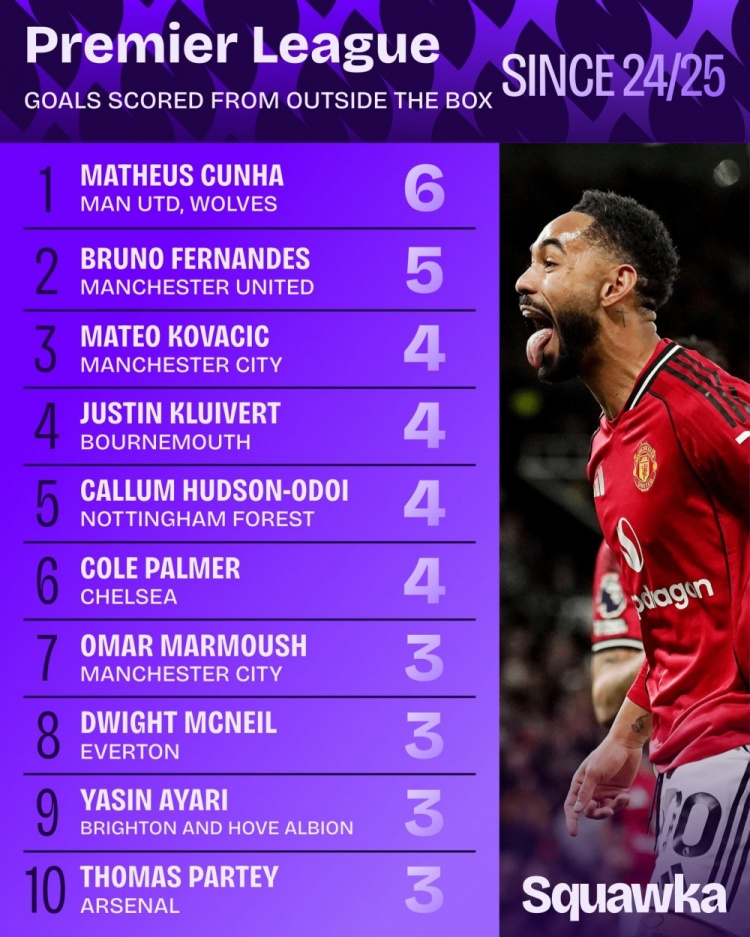1.马特乌斯-库尼亚,曼联、狼队,6球
